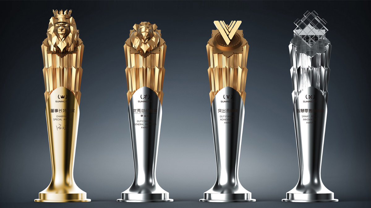 秉承企业核心精神,全力对苏宁品牌IP“狮子”形象进行应用及创新,致力打造全新奖杯视觉语言及树立积极奋进的企业形象。董事长特别奖,以苏宁企业形象“狮子”为原型进行抽象化艺术处理,使之更具威严、工者气序;优秀总经理奖,颁发对象为苏宁集团各大区有杰出贡献的高管,将狮头处理成勋章形式,以表彰高管们的杰出贡献;突出贡献奖,此奖项颁发给具有杰出贡献的团队。因此取“ictory:胜利”的含义,以多重重叠的“V”表示团队协作的无穷力量;智慧零售创新奖,这一特别奖项用予表彰苏宁智慧新零售团队。这一年在智慧新零售行业的特别突出贡献,以四阶魔方象征更多一层的智慧,同时独特的水晶材质以彰显这一特别奖的独特含义。