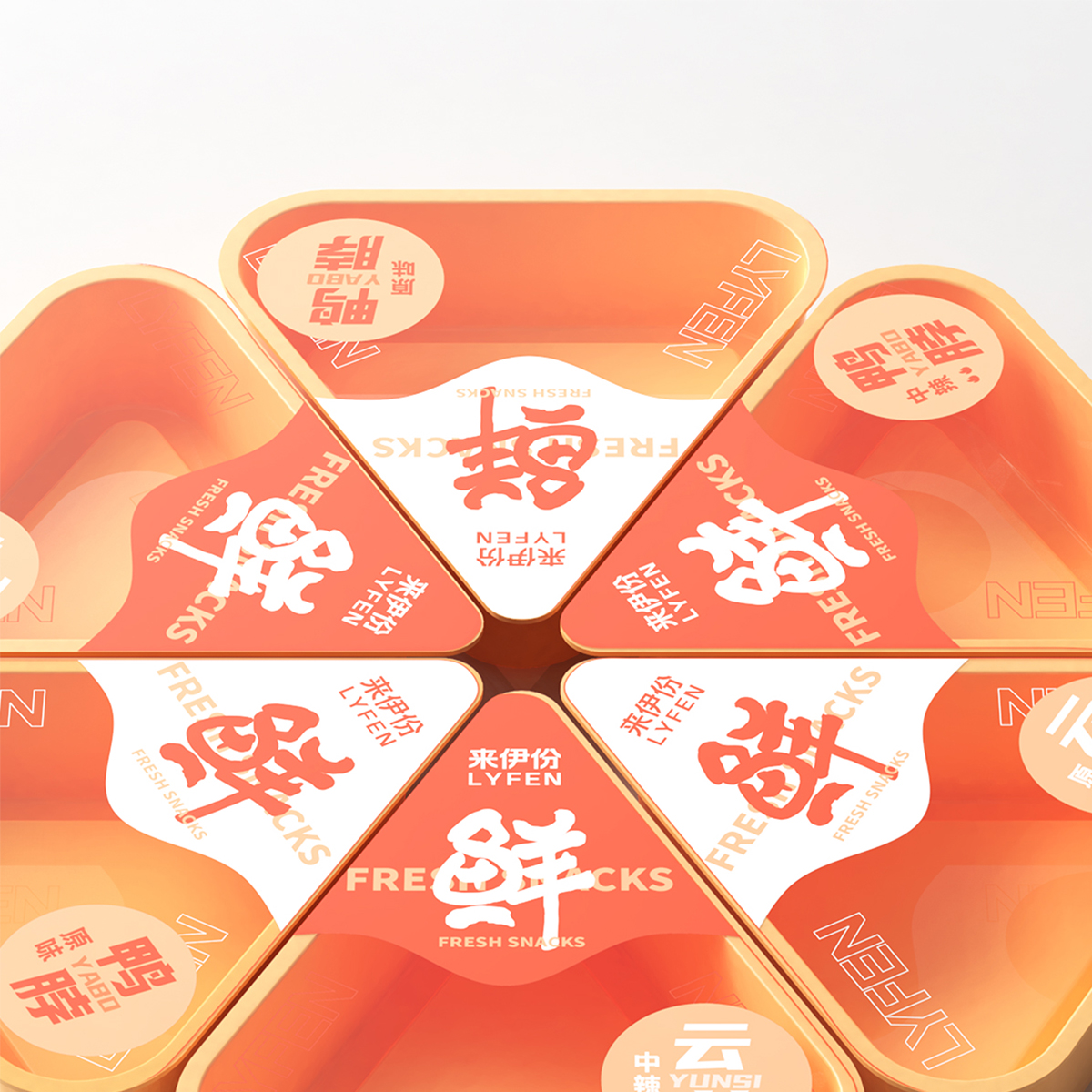来伊份-给生活加道菜:八边食盒,为味觉锦上添花。采用了中国传统餐具锦盒的八边造型,八也象征着八方来客,兼容并蓄,雅俗共赏的包容态度,与来伊份的品牌文化相符。底部贴纸内附纸巾手套包,提升消费者食用体验。活力鲜食,运用高饱和的明艳色彩和可爱年轻的鸭子形象提升视觉吸引力。