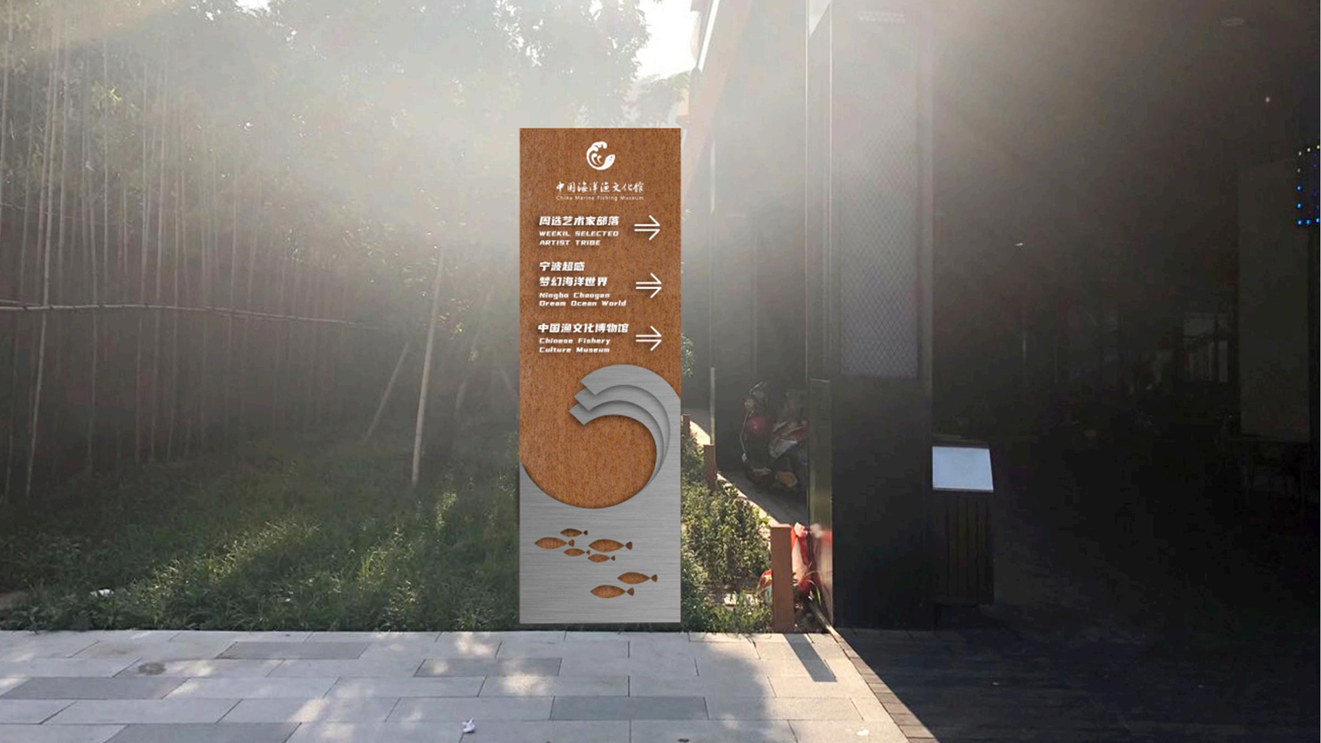 该馆以历史为脉络,部分还原了渔村旧貌,运用AR、裸眼3D等技术,展现了象山以海为生、与海共荣的海洋文化发展历程和我国海洋渔文化的多样性和丰富性。同时,中国海洋渔文化馆充分利用旧厂区空间,建设了城市会客厅、文创非遗孵化区等项目。我们团队将导视设计以渔文化为切入点进行。